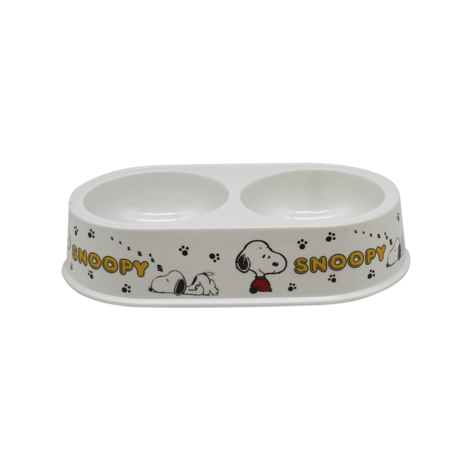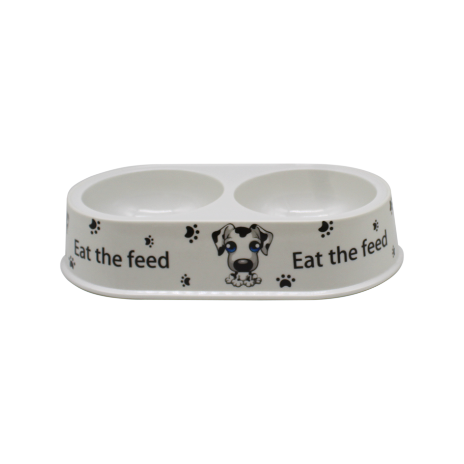 Comedero para mascota en melamina blanca con diseño.