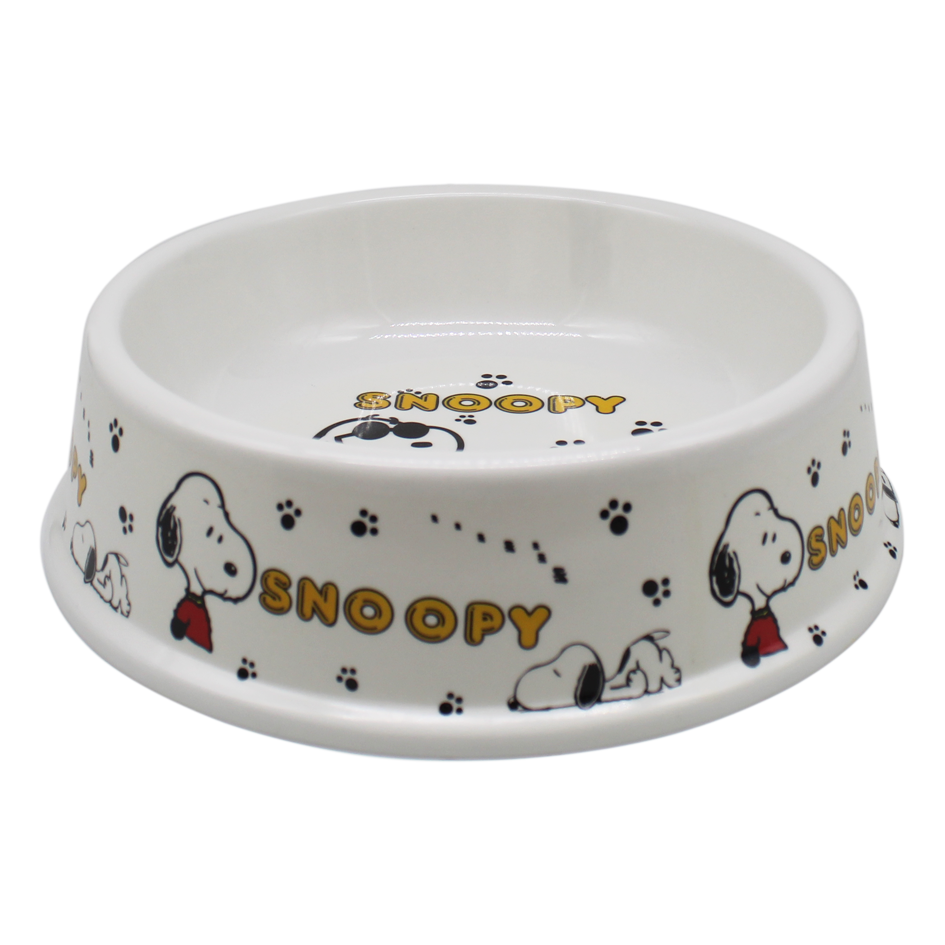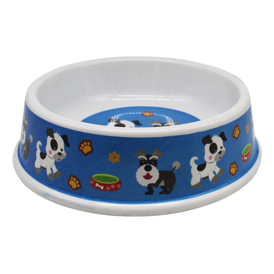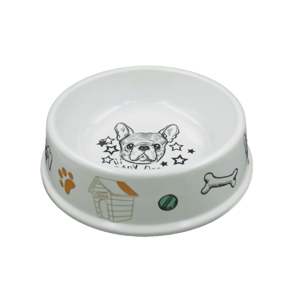 Comedero para mascota en melamina blanca con diseño.